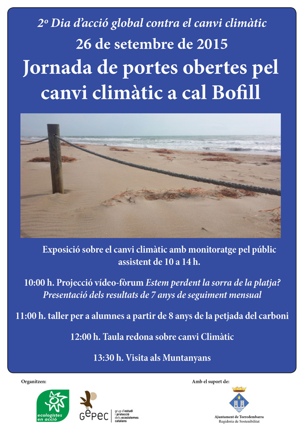 El dia 26 de setembre de 10 a 14 h es celebrarà una jornada de portes obertes organitzada per GEPEC-EdC i Ecologistes en Acció a Cal Bofill (Centre d’Activitats Ambientals) de Torredembarra.