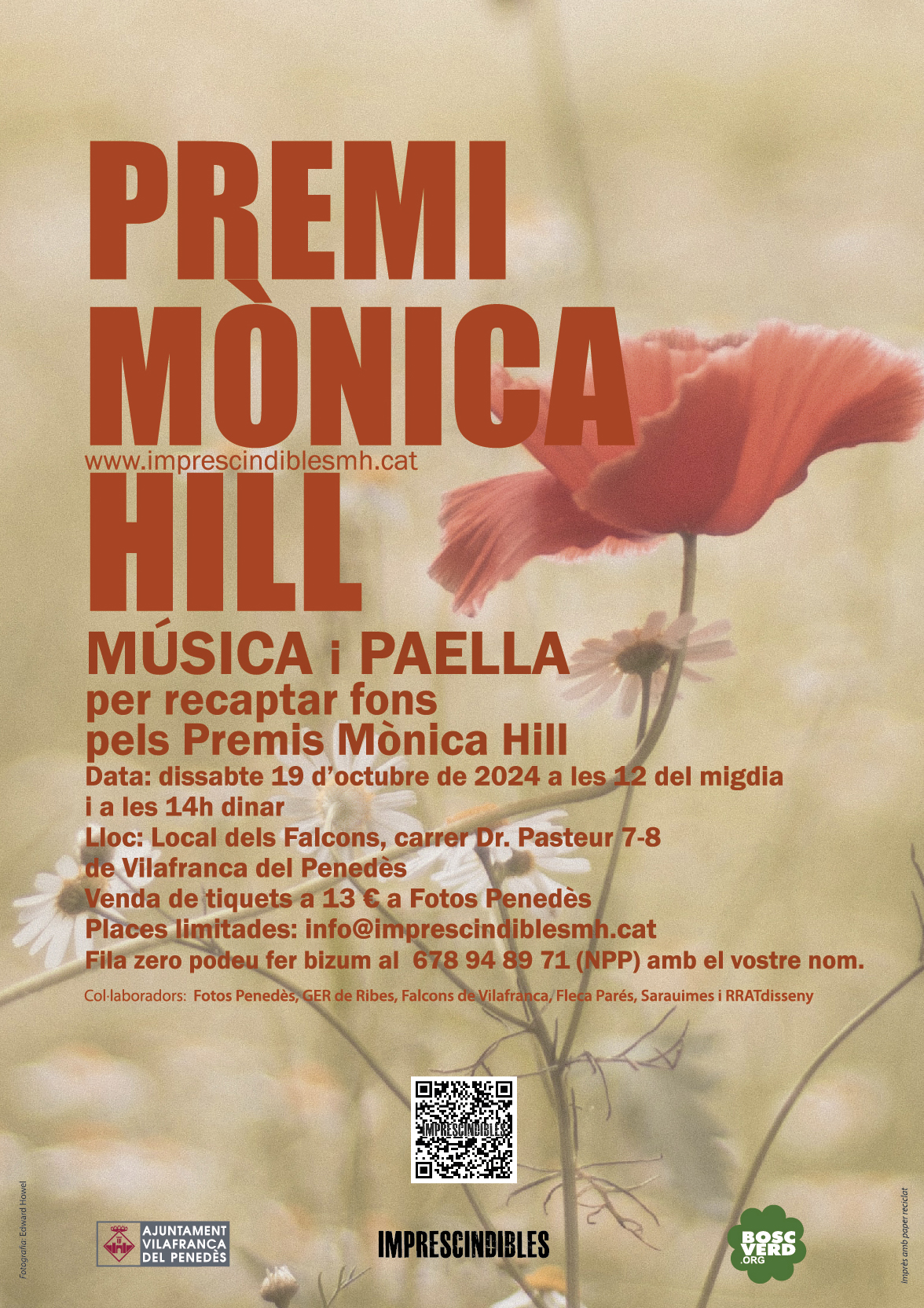 El dissabte 19 d’octubre de 2024, al local dels Falcons de Vilafranca del Penedès, al carrer Doctor Pasteur 7-8, el Col·lectiu Imprescindibles i el Col·lectiu Ecologista Bosc Verd – EdC, fem un acte amb el títol de Música i Paella, per recaptar fons econòmics pels Premis Mònica Hill 2024.